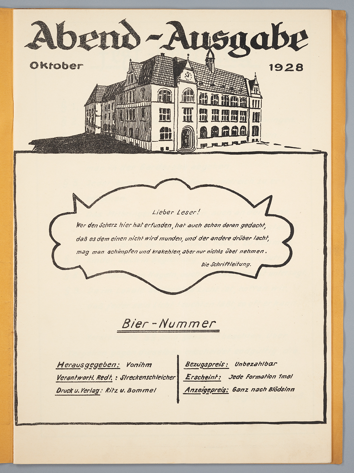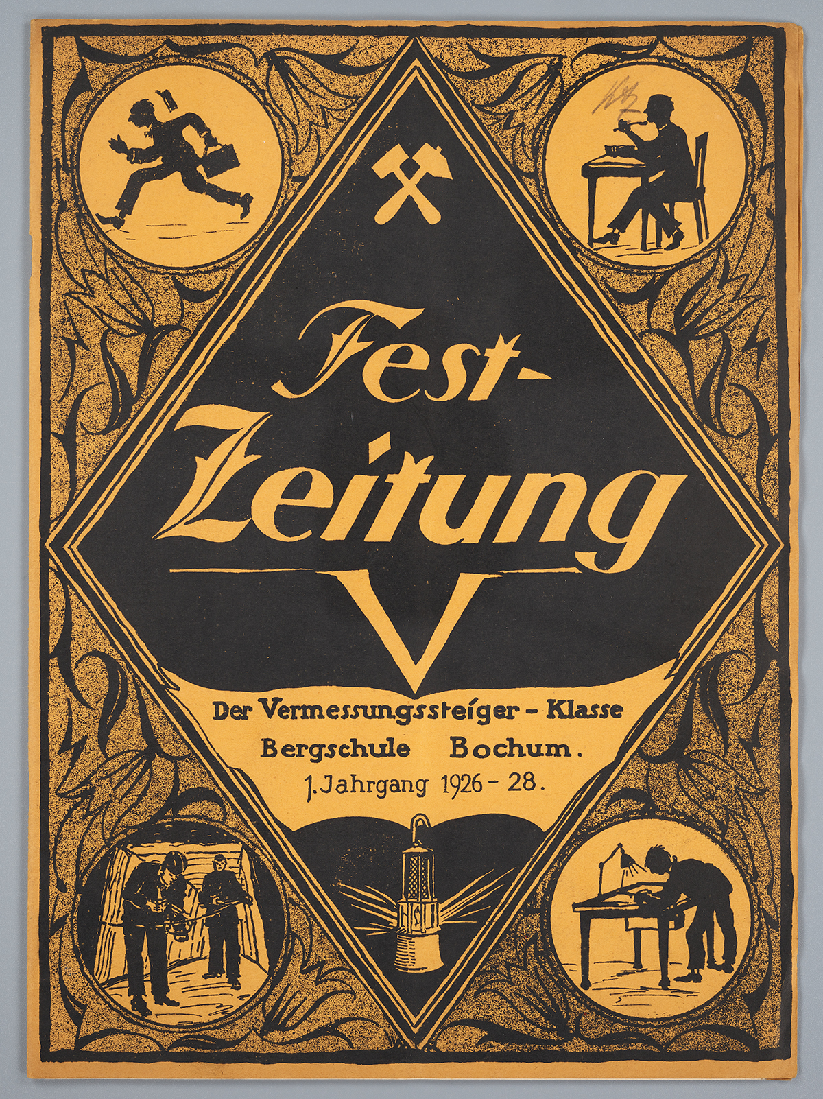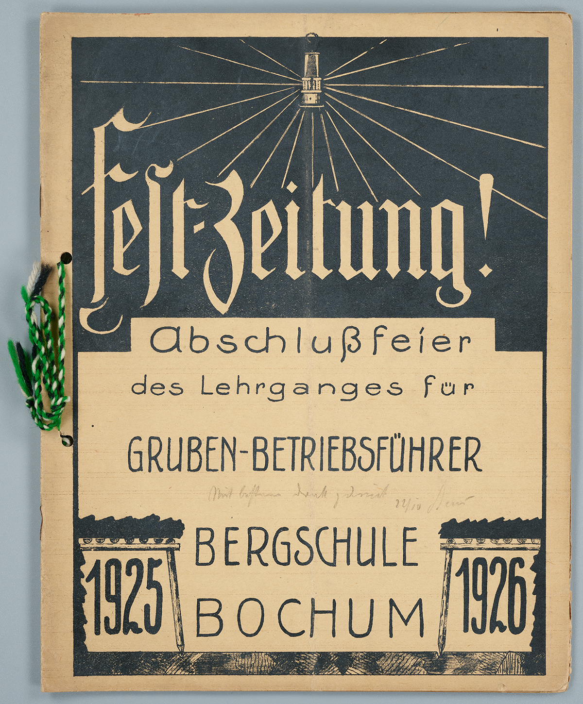 Die „Fest-Zeitung | Der Vermessungssteiger-Klasse | Bergschule Bochum. | 1. Jahrgang 1926 – 28“ (montan.dok/BBA 120/4618), überschrieben mit „Abend-Ausgabe | Oktober 1928“ nimmt bereits im Innentitel sowohl auf das Bergschulgebäude als auch auf den Charakter einer „Bierzeitung“ Bezug. So findet sich unter einer Zeichnung des Schulgebäudes an der Herner Straße in typisch humoristisch-satirischem Duktus der Eintrag „Bier-Nummer“. Herausgegeben war sie demnach „Von ihm“, als verantwortlicher Redakteur zeichnete ein gewisser „Streckenschleicher“ – sicher in scherzhaftem Bezug auf den bergmännischen Begriff der „Strecke“ als zumeist söhlig aufgefahrener Grubenbau mit gleichbleibendem Querschnitt in Längsrichtung – und ihr Bezugspreis war schlechthin „Unbezahlbar“.