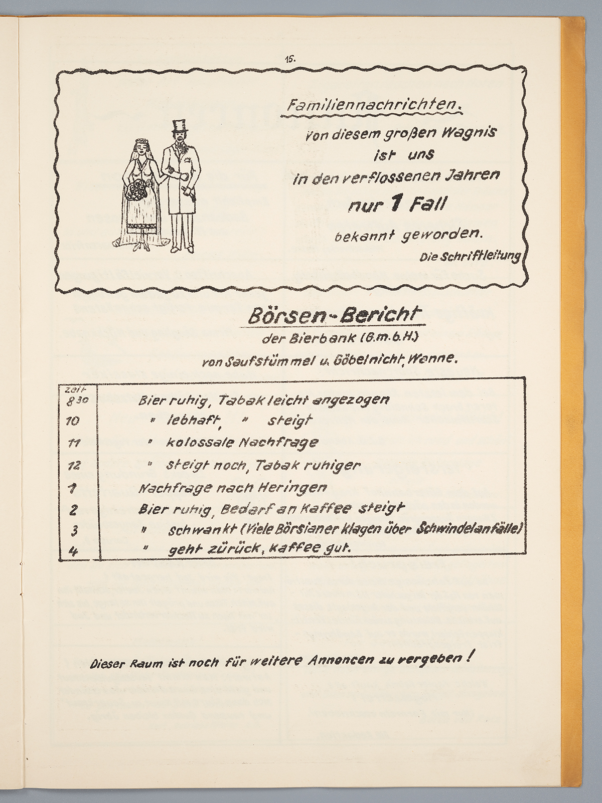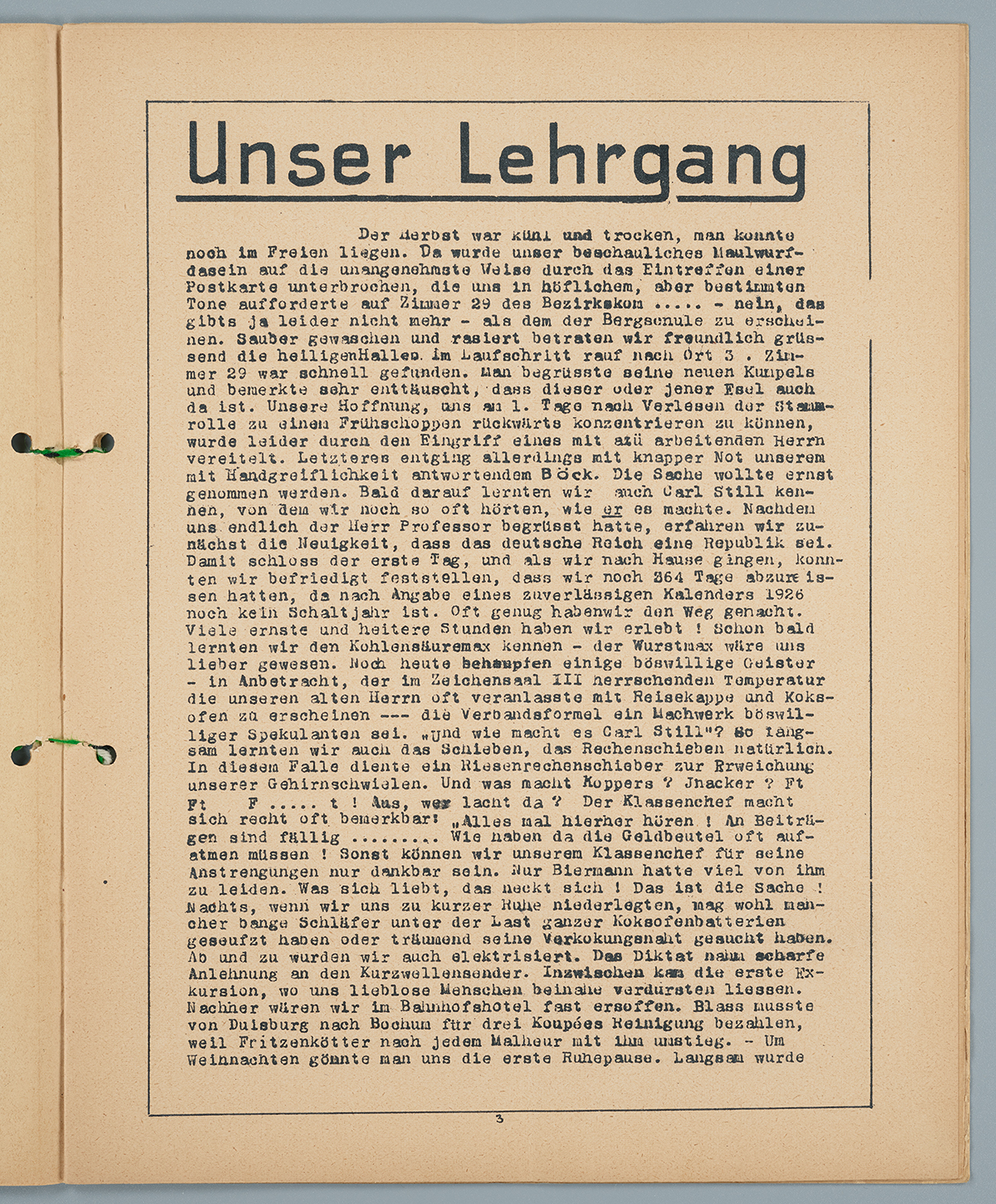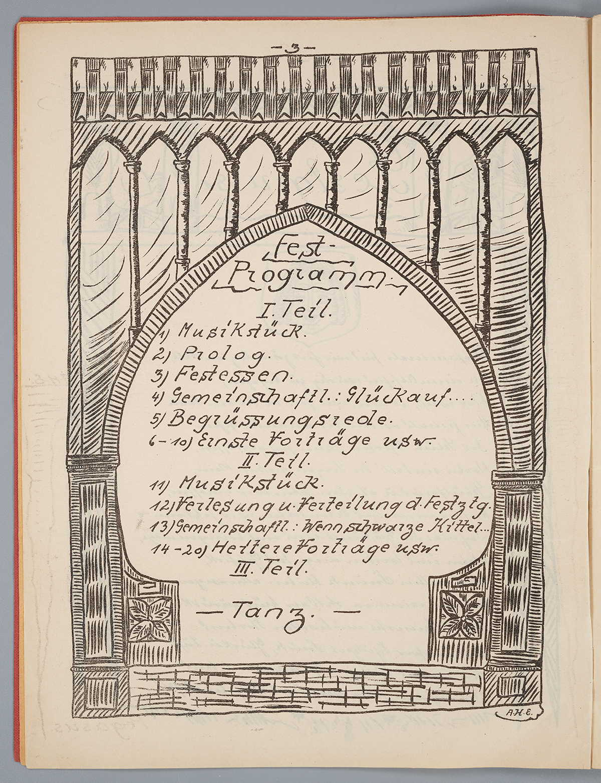 Die „Fest-Zeitung | Der Vermessungssteiger-Klasse | Bergschule Bochum. | 1. Jahrgang 1926 – 28“ (montan.dok/BBA 120/4618), überschrieben mit „Abend-Ausgabe | Oktober 1928“ nimmt bereits im Innentitel sowohl auf das Bergschulgebäude als auch auf den Charakter einer „Bierzeitung“ Bezug. So findet sich unter einer Zeichnung des Schulgebäudes an der Herner Straße in typisch humoristisch-satirischem Duktus der Eintrag „Bier-Nummer“. Herausgegeben war sie demnach „Von ihm“, als verantwortlicher Redakteur zeichnete ein gewisser „Streckenschleicher“ – sicher in scherzhaftem Bezug auf den bergmännischen Begriff der „Strecke“ als zumeist söhlig aufgefahrener Grubenbau mit gleichbleibendem Querschnitt in Längsrichtung – und ihr Bezugspreis war schlechthin „Unbezahlbar“.