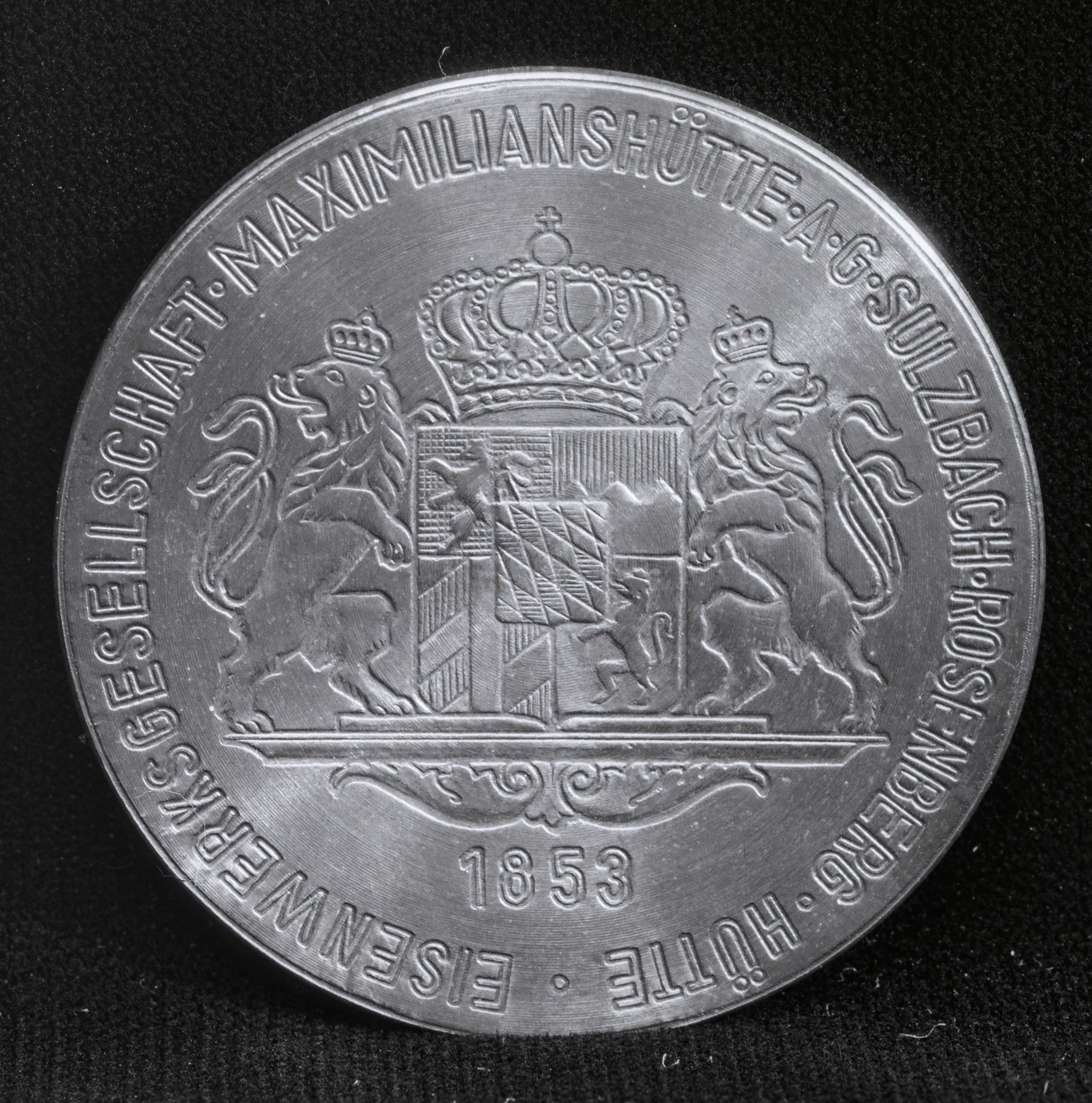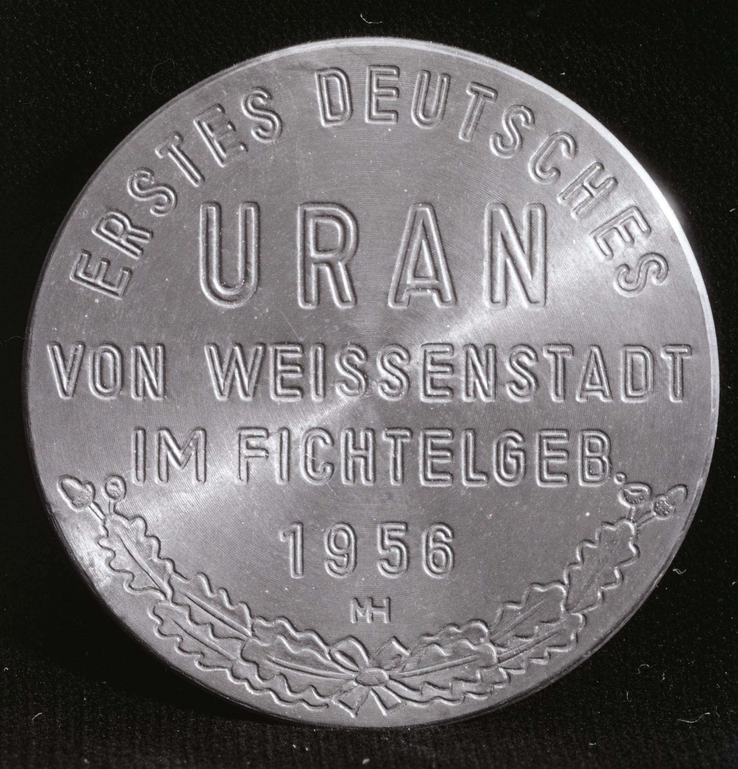 Auch die 1970 für das DBM erworbene Uranmedaille gehört zu der kleineren Ausführung. Auf dem Avers ist zu lesen: „ERSTES DEUTSCHES URAN VON WEISSENSTADT IM FICHTELGEBIRGE 1956 MH“, darunter sind zwei Eichenzweige zu erkennen. Auf dem Revers sind das bayerische Wappen und darunter die Jahreszahl 1853 zu sehen. Die Umschrift lautet: „EISENWERKSGESELLSCHAFT. MAXIMILIANSHÜTTE. A.G. SULZBACH-ROSENBERG. HÜTTE“. Die Buchstaben MH auf der Vorderseite und die Jahreszahl auf der Rückseite beziehen sich jeweils auf die Maximilianshütte. Die Medaille wiegt 55 g und hat einen Durchmesser von 40 mm.