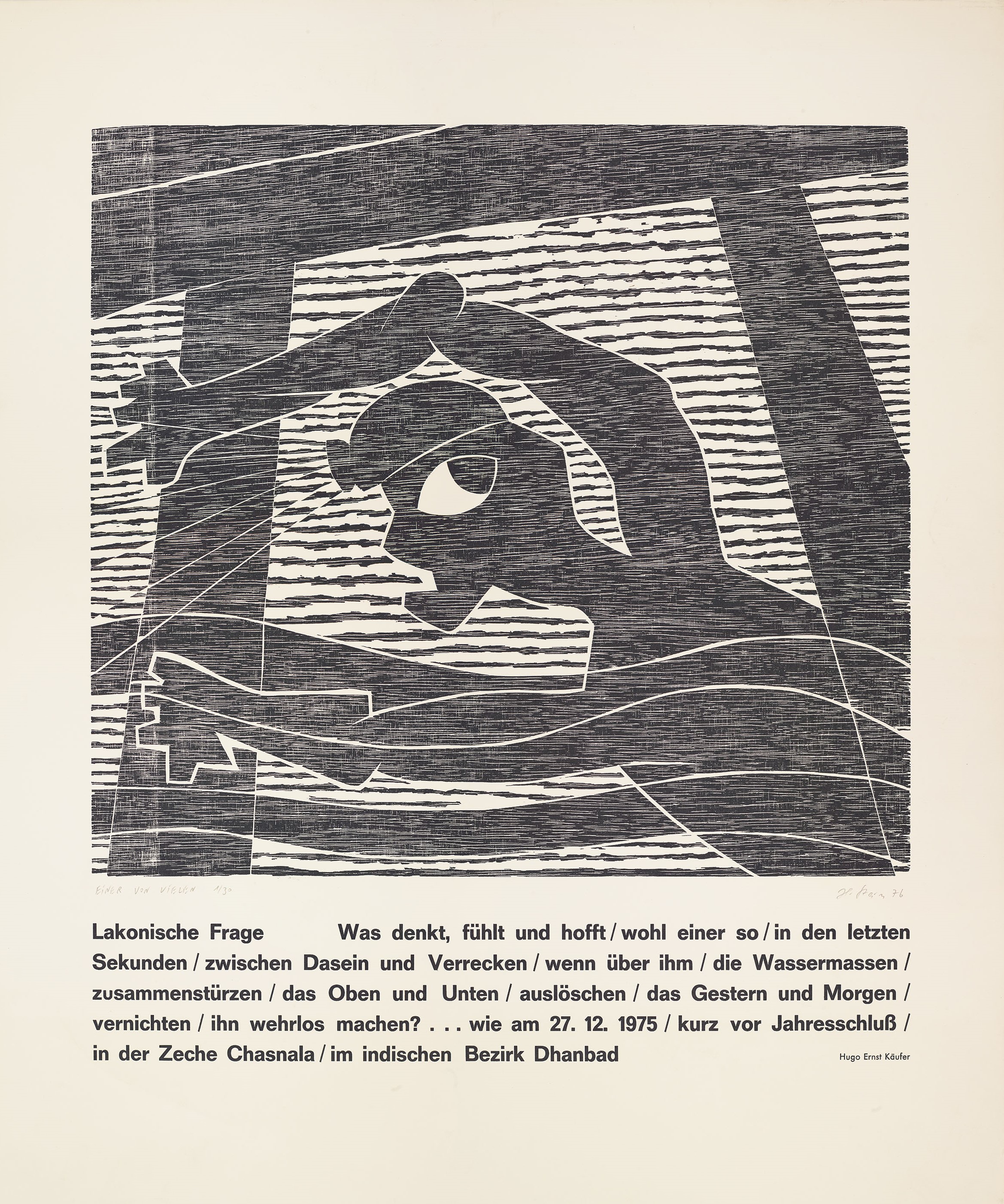 Die beiden heute noch in den Musealen Sammlungen des DBM befindlichen Holzschnitte zeigen einen Bergmann, über den sich die in den Stollen hereinstürzenden Wassermassen ergießen. Unter einen der Schnitte ist besagter Text nämlich ein Gedicht des Lyrikers und Essayisten Hugo Ernst Käufer gesetzt worden: „Lakonische Frage Was denkt fühlt und hofft / wohl einer so / in den letzten Sekunden / zwischen Dasein und Verrecken / wenn über ihm / die Wassermassen / zusammenstürzen / das Oben und Unten / auslöschen / das Gestern und Morgen vernichten / ihn wehrlos machen? … wie am 27.12.1975 / kurz vor Jahresschluß / in der Zeche Chasnala / im indischen Bezirk Dhanbad“.