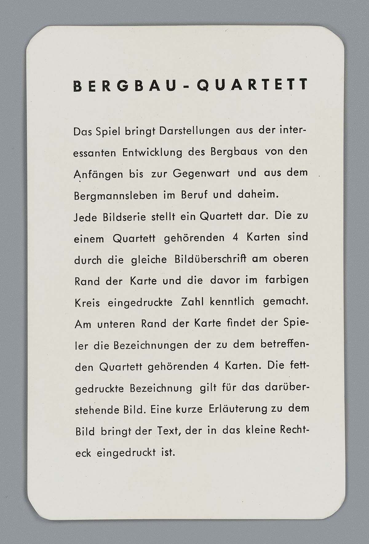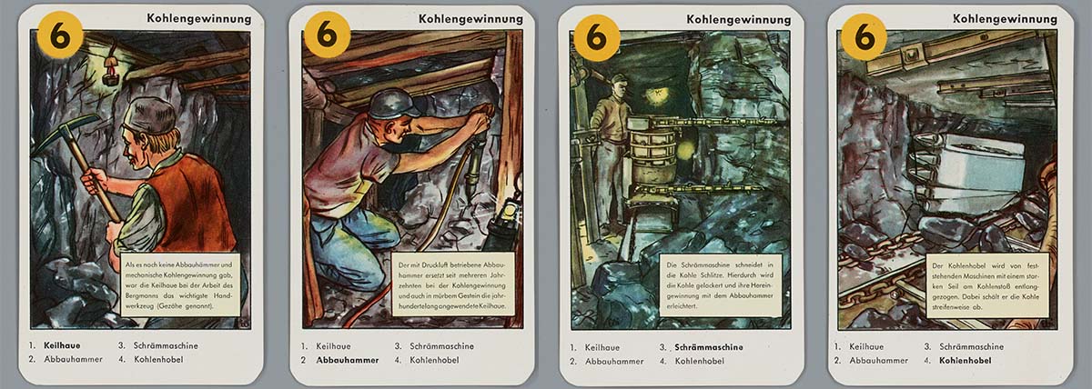 Das vorliegende Quartett ist demnach nicht nur ein Lernspiel, sondern muss auch als Werbemittel gesehen werden. Durch das Sammeln und Bewahren solcher Objekte ermöglicht das Montanhistorische Dokumentationszentrum einen Einblick in eine Zeit, in der die Bergbaubranche diese Möglichkeit der Einflussnahme in Kinderzimmern und auf Schulhöfen gerne nutzte, um den so dringend benötigten Nachwuchs zu rekrutieren.