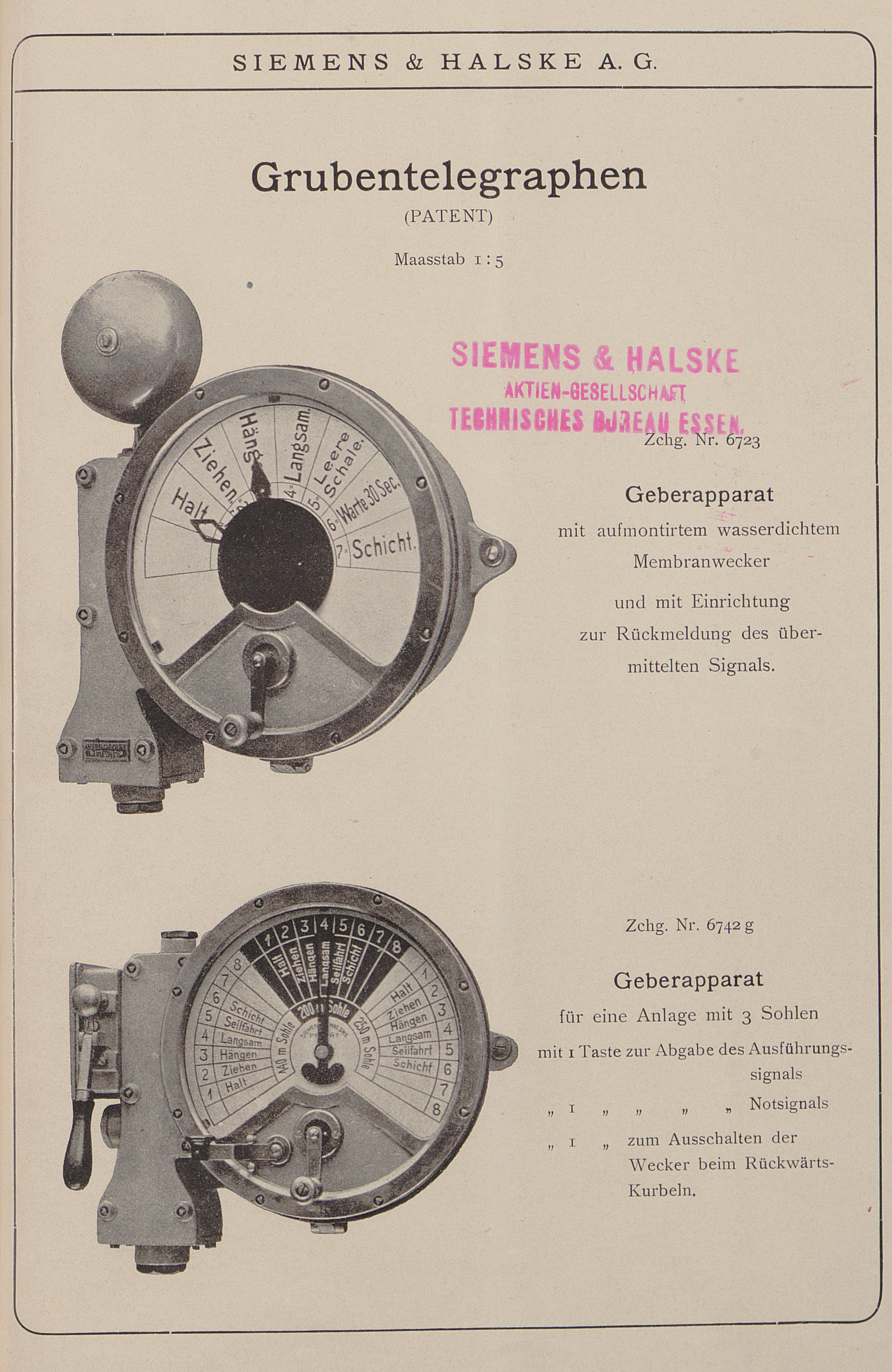 Die Lautstärke in den Zechenbetrieben war zumal durch den Einsatz mechanisierter Fördertechnik angestiegen. Weil an die Schachtsignalanlage angeschlossene Rasselwecker oder Glocken gegen diese Geräuschkulisse häufig nicht ankamen, wurden sie durch optische Signale ergänzt. Die aus der Schifffahrt zur Kommunikation zwischen Kapitän und Maschinenraum bekannten Zeigertelegraphen besaßen ein Ziffernblatt, das über Felder mit Aufschriften wie „Auf“, „Halt“ oder „Seilfahrt“ verfügte. Mit Hilfe einer Drehkurbel wurde ein Zeiger über die Felder bewegt und seine Stellung auf ein Empfängergerät übertragen. Bei jedem Wechsel der Zeigerposition ertönte zusätzlich ein bestimmter Signalton.