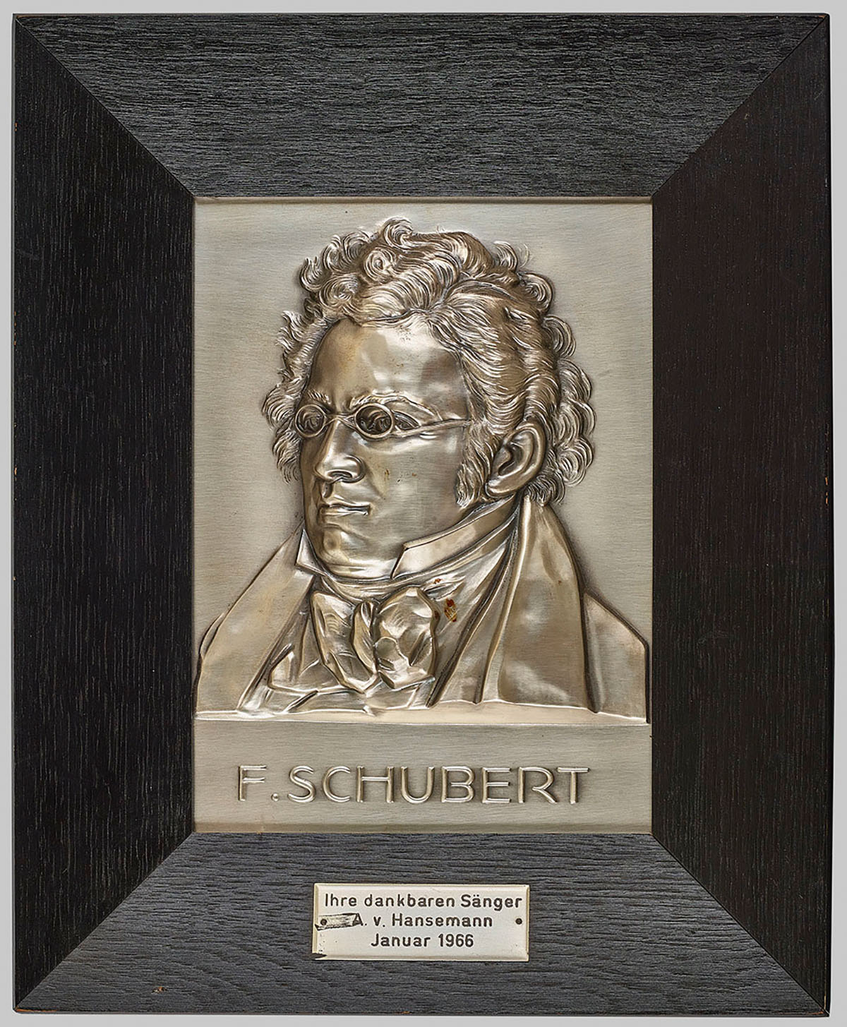 Das anonyme Relief zeigt den Komponisten Schubert nach rechts blickend im Halbprofil mit der für ihn typischen Brille und einer modischen Halsbinde. Als Vorlage kommt eine Lithographie von Joseph Kriehuber (1800-1876) in Betracht, die wiederum die wenigen authentischen, zu Lebzeiten des Musikers entstandenen Porträts variiert. Das Relief steht damit in einer langen Reihe von Schubert-Bildnissen bzw. -Reproduktionen, die vom 19. bis weit in das 20. Jahrhundert für einen wachsenden Markt für Künstler- und Gelehrtenporträts, etwa in Büchern und auf Postkarten, hergestellt wurden.