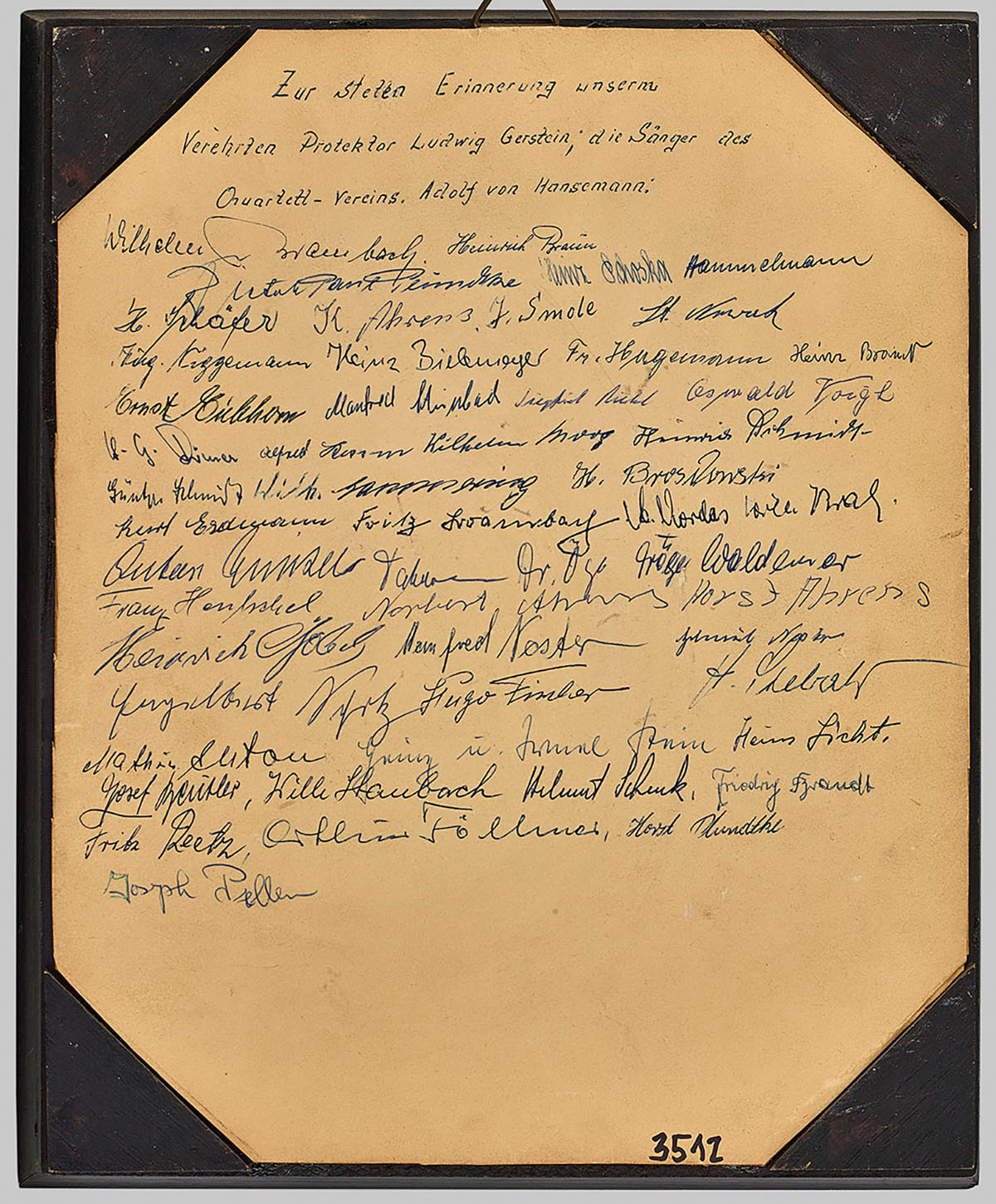 Der 1923 unter dem Namen „Quartettverein Mengede“ im Norden Dortmunds gegründete Gesangsverein entstand im Umfeld der dortigen Zeche Adolf von Hansemann, auf die er ab 1935 mit der Umbenennung in „Quartettverein Adolf von Hansemann“ unmittelbar Bezug nahm. Der überwiegend aus Zechenbeamten bestehende Männerchor war überregional erfolgreich und wurde bereits wenige Jahre nach seiner Gründung 1928 beim „Deutschen-Sänger-Bundesfest“ in Wien mit einer Schubert-Plakette ausgezeichnet. Das Geschenk für Ludwig Gerstein zeigt, dass der Chor noch in den 1960er-Jahren aktiv war. Allerdings wissen wir nichts Genaueres über seine weitere Geschichte. Sicher ist, dass der Chor 2019 wegen Überalterung und Nachwuchsmangel endgültig aufgelöst wurde. Die Zeche Adolf von Hansemann existierte zu diesem Zeitpunkt schon lange nicht mehr. Ihr letzter Direktor von 1966 bis 1967 war Ludwig Gerstein (1928-1994), der sich in dieser Funktion als Protektor, d. h. Förderer, des Chors hervorgetan hatte.