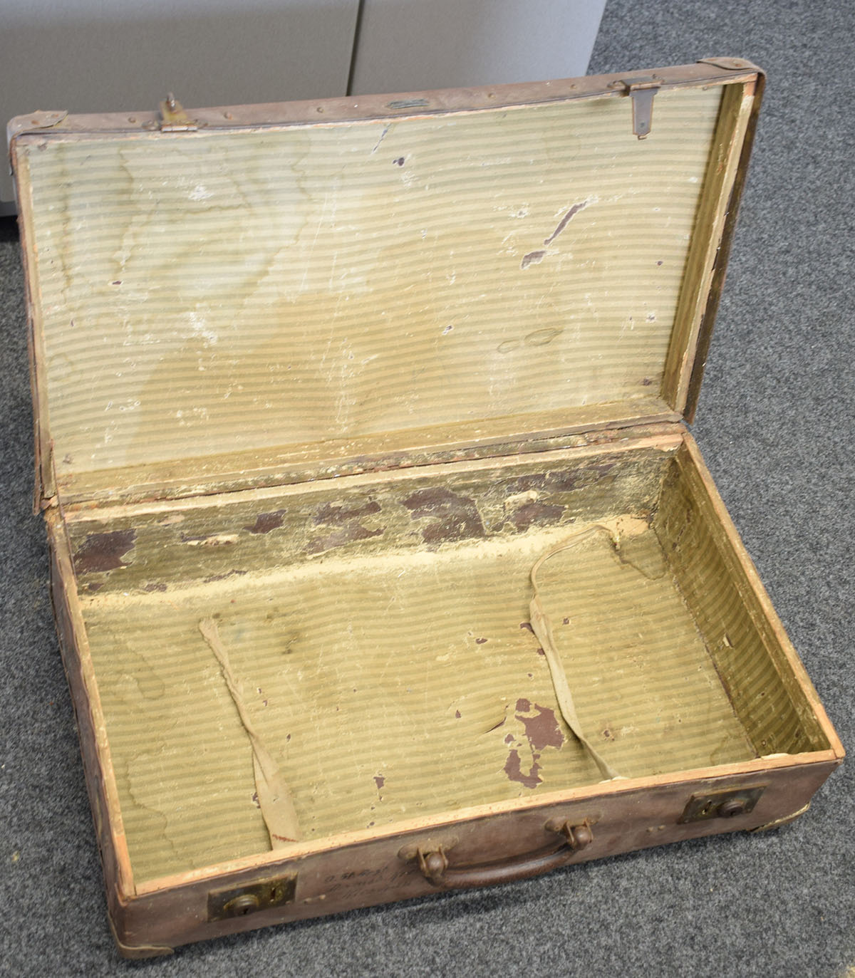 Der Koffer – so bezeugt die Beschriftung – stammt von einem „O.St. Arzt“ Dr. med. Kretschmar aus Kirschau, einer kleinen Gemeinde in der Oberlausitz, knapp 10 Kilometer südlich von Bautzen. Das Kürzel verweist auf den Rang als Oberstabsarzt in der nationalsozialistischen Wehrmacht des vormaligen Besitzers. Es handelt sich bei dem Koffer um einen einfachen, mit Vulkanfieber – ein Material aus in Zinkchlorid getränkter Zellulose als Lederersatz – bespannten Reisekoffer, wie er im 20. Jahrhundert üblich war. In Knabes Besitz gelangte er durch die Hochzeit mit Rikarda Kretschmar, Tochter des Arztes. Als Objekt interessant wird er nicht durch seine Art oder die Beschriftung, sondern durch seinen Besitzer Wilhelm Knabe und dessen Nutzung.