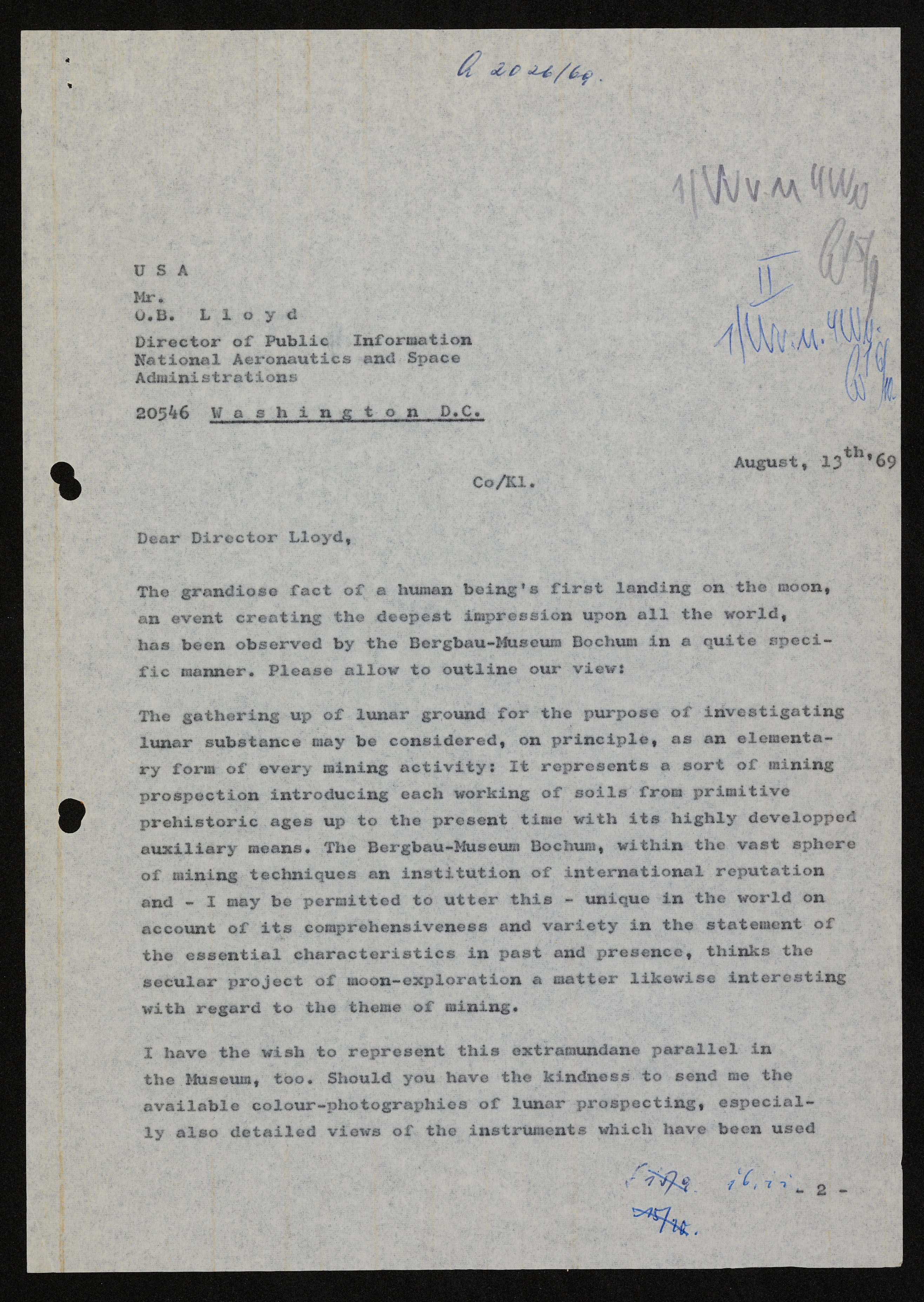 Bergassessor a. D. Hans Günter Conrad, der damalige Museumsdirektor, schrieb am 13. August 1969 an O. Bill Llyod, den Director of Public Information der NASA, um ihm seine Sicht auf die Mondlandung zu erläutern (vgl. auch im Folgenden montan.dok/BBA 112/930). Im deutschen Entwurf des Schreibens formuliert Conrad: „Die Aktionen des Aufsammelns von Mondgestein zur geologischen Erforschung der Mondsubstanz können im Prinzip als eine elementare Form der bergmännischen Tätigkeit gelten: als Prospektionen, die von alters her bis zu den sich auf modernste Hilfsmittel stützenden Aufschlußversuchen von heute am Anfang jeglicher Bodenbearbeitung stehen.“