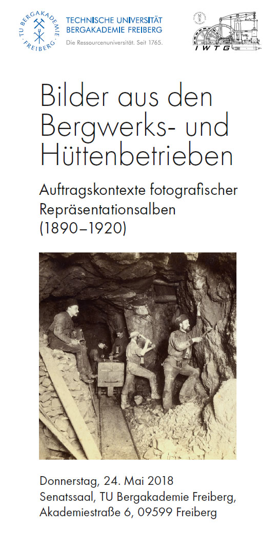 Die vom Institut für Industriearchäologie, Wissenschafts- und Technikgeschichte TU Bergakademie Freiberg am 24. Mai 2018 veranstaltete Tagung beschäftigt sich speziell mit den Auftragskontexten fotografischer Repräsentationsalben (1890-1920), einer frühen Form der Öffentlichkeitsarbeit. Sie sollten beispielsweise im Kontext von Weltausstellungen ein positives Bild der Montanindustrie vermitteln. Anmeldeschluss ist der 30.04.2018.