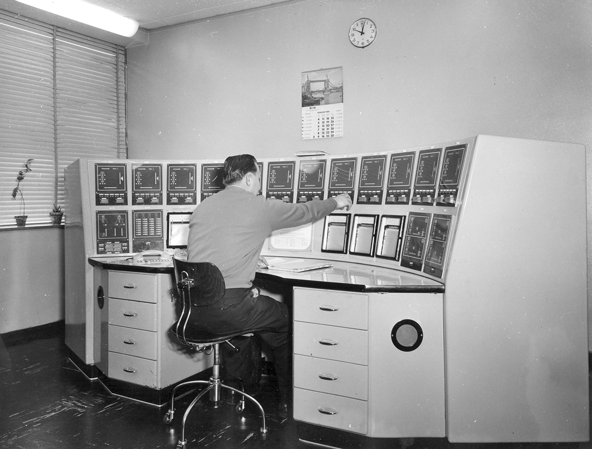 Die Zukunft des Bergbaus: Steuerpult der Grubenwarte der Zeche Sophia Jacoba von 1967