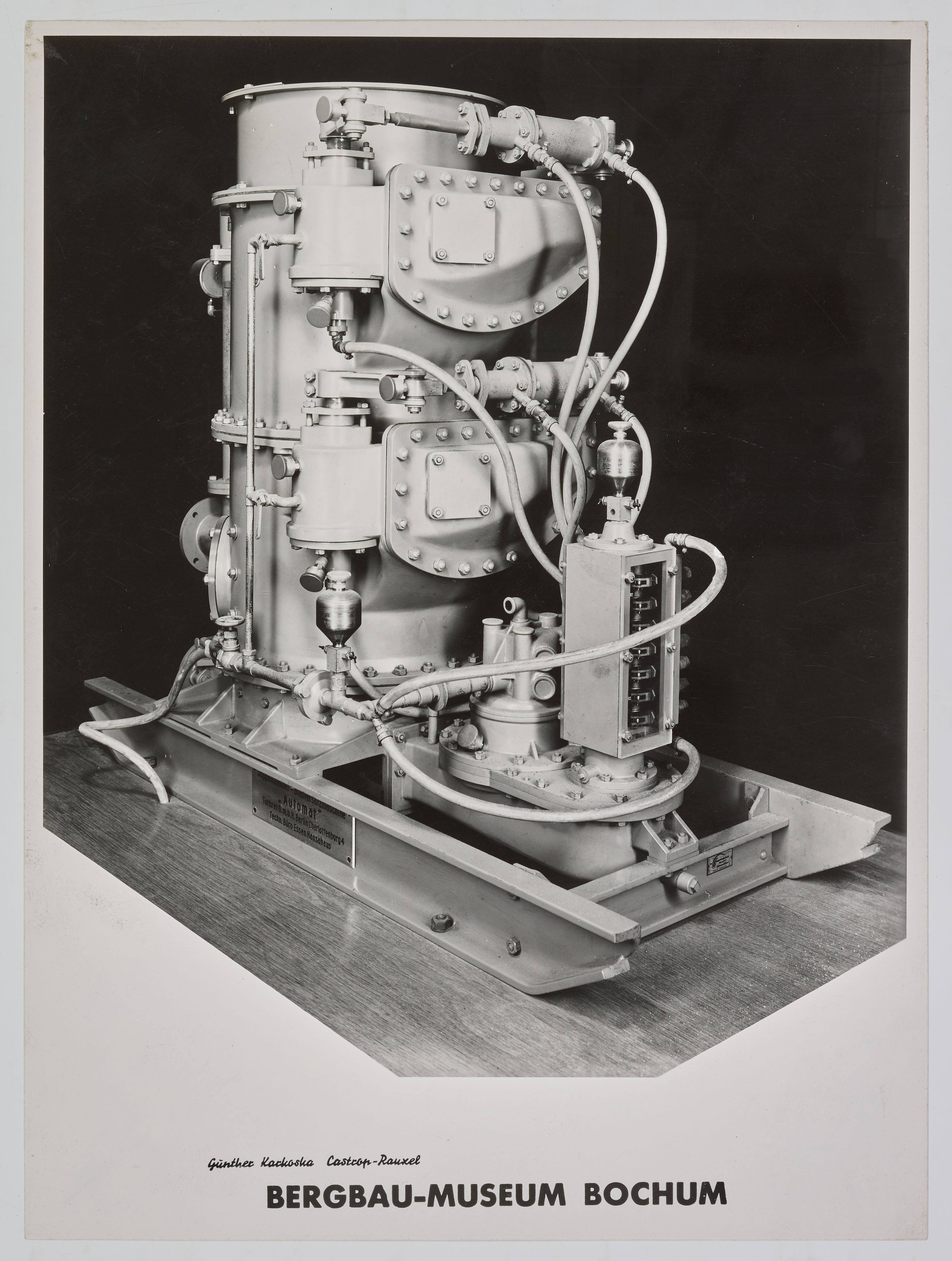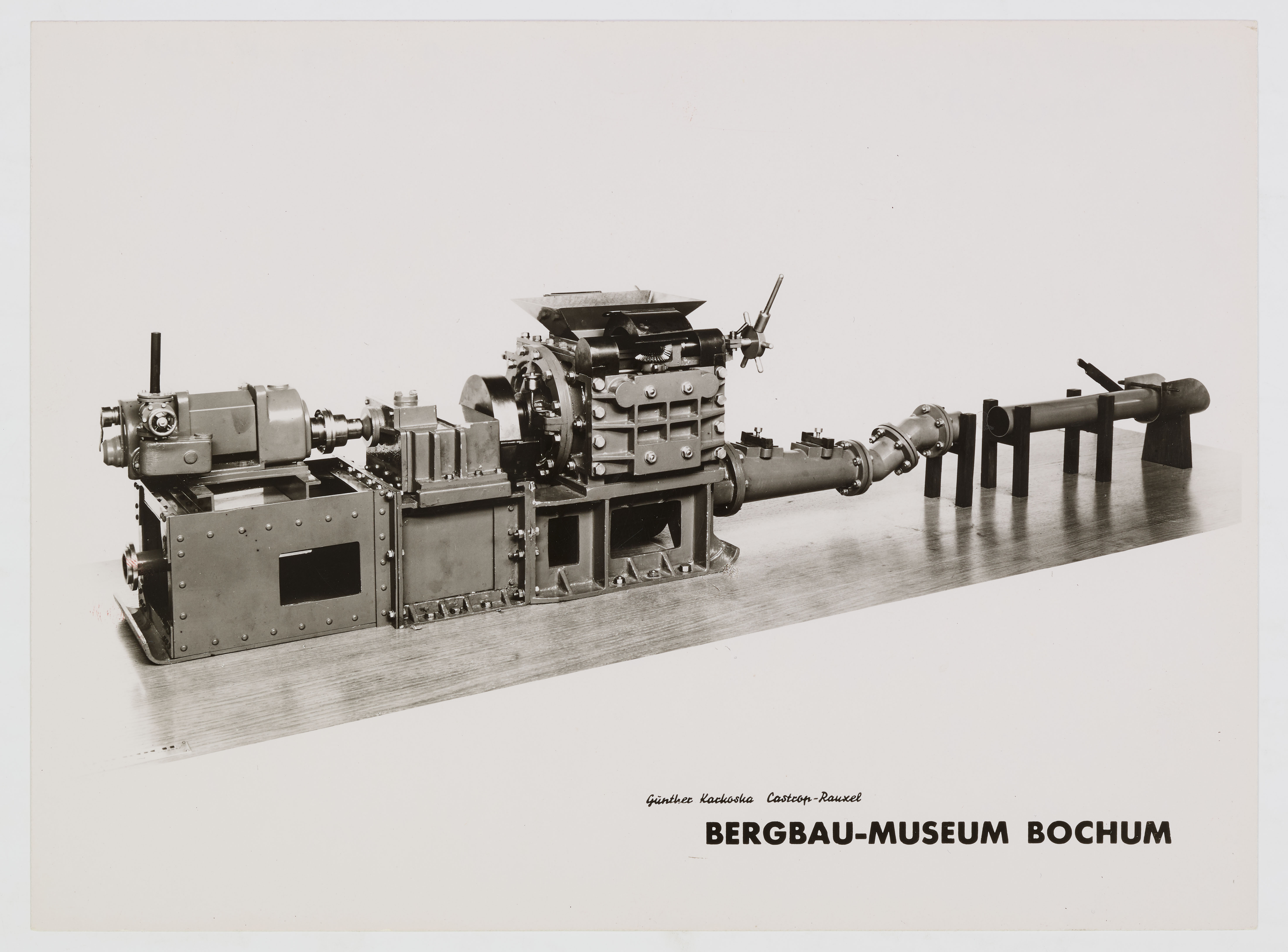 Mehr als dieser Satz ist dem Jahresbericht über die Ausstellung nicht zu entnehmen. Im Tätigkeitsbericht des Museums für den Februar 1946 heißt es lediglich noch, dass es sich um eine Wanderausstellung handele (vgl. montan.dok/BBA 112/2232). Weitere Informationen finden sich aber in einer Akte über diese „England-Ausstellung“, die als Teil des Bestandes 112: Deutsches Bergbau-Museum Bochum, Bochum, im Bergbau-Archiv Bochum verwahrt wird (vgl. auch im Folgenden montan.dok/BBA 112/1874). Aus der Akte geht hervor, welche Dinge für die Ausstellung in England ausgeliehen wurden bzw. vorgesehen waren: Vier Modelle, nämlich Zollverein XII, ortsveränderliche vollautomatische Doppelkammer-Blasversatzmaschine Automat der Firma Torkret GmbH (montan.dok 030001308000), ortsveränderliche Blasversatzmaschine nach dem Zellenradsystem der Firma Beien (montan.dok 030001307000) und Wasserhaltung durch Schöpfräder (montan.dok 030021027000), des Weiteren eine Beamtenlampe der Firma Dominit Dortmund und ein Stereobetrachtungsapparat mit 480 Stereo-Diapositiven. Zudem wurden Fotografien von den aktuell im Bergbau-Museum Bochum ausgestellten Objekten verlangt. Das im Museum zur Verfügung stehende Modell der Zeche Zollverein stellte sich allerdings als zu groß heraus und wurde durch ein anderes, das noch auf dem Gelände der Zeche Zollverein vorhanden war, ersetzt. Von den Stereo-Diapositiven wurden lediglich 200 ausgeliehen, die anderen 280 durften in Bochum bleiben. Von den von dem Fotografen Günther Karkoska erstellten Fotografien wurden schließlich 103 mit insgesamt 587 Abzügen übergeben. Neben den schon genannten Objekten findet sich ein Hinweis, dass noch eine weitere Lampe, ein Bergeisen und ein Fäustel für London bereitgestellt werden mussten, die offenkundig nicht mehr nach Bochum zurückkehrten.